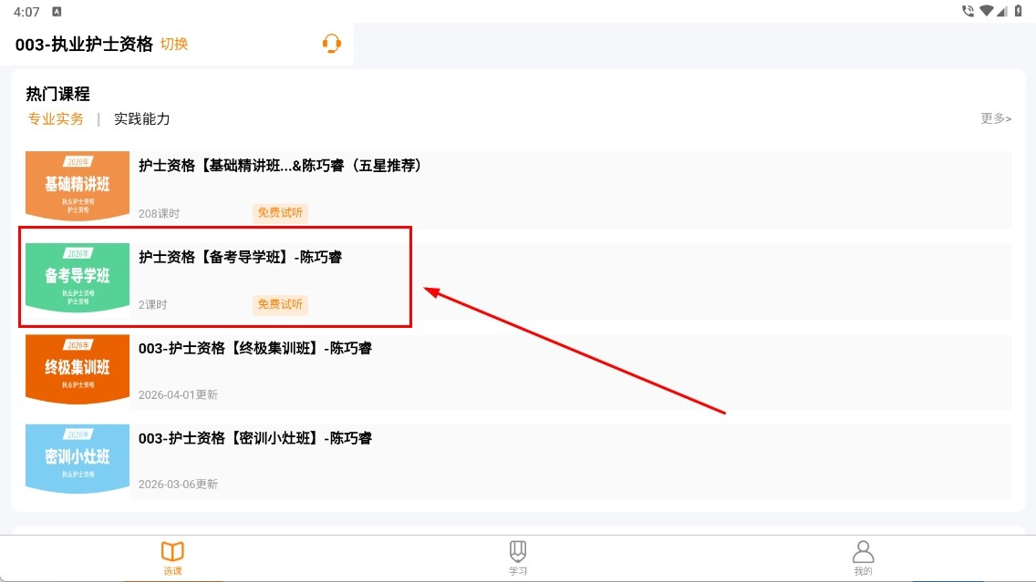 在选课界面,点击类似【护士资格(备考导学班)-陈巧睿】这样的课程,即可进入课程学习页面。