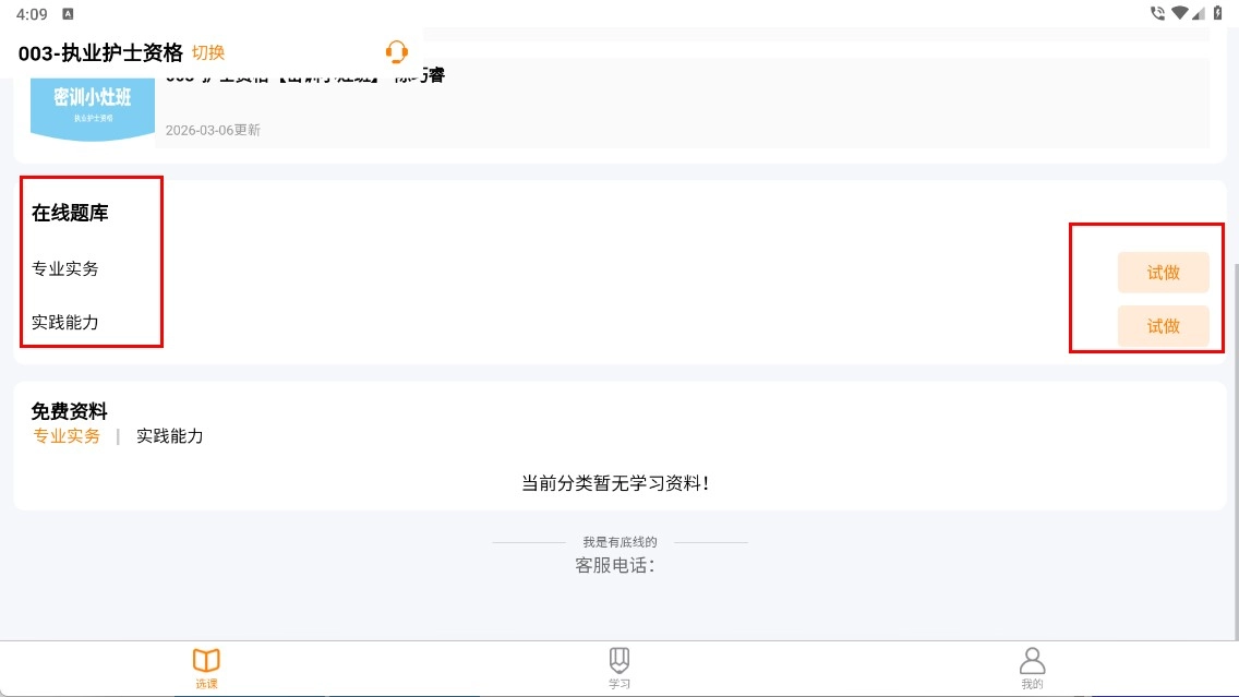 在学习板块中,先进入在线题库,接着选择【专业实务】和【实践能力】这两种题型,最后点击【试做】按钮就能开始习题练习了。