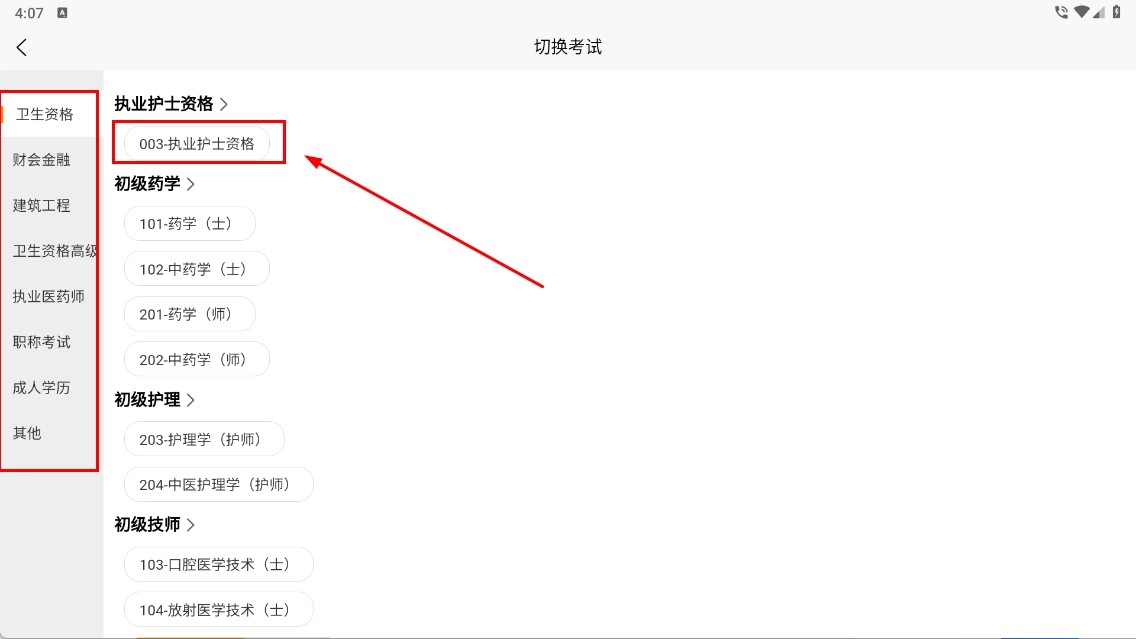 在考试切换界面,选择像【003-执业护士资格】这样的考试类别,就能进入相应的学习板块。