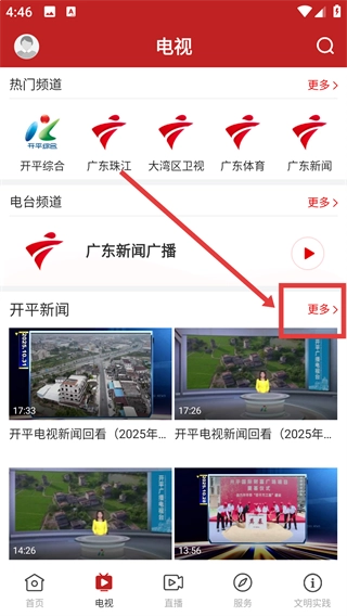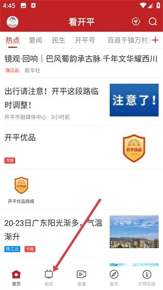 在“看开平”的首页,点击页面底部的【电视】按钮,即可进入电视板块。