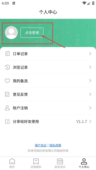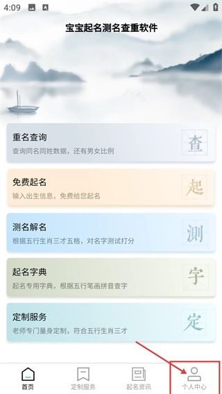 进入软件的首页后,能看到【重名查询】【免费起名】之类的功能选项,点击页面底部的【个人中心】,就可以进入到与个人相关的操作页面。
