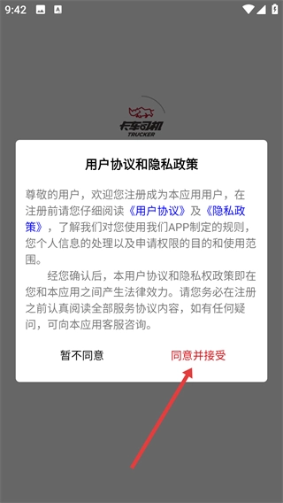 在使用【卡车司机】服务前,请务必仔细阅读【用户协议】与【隐私政策】,在充分了解相关规则及个人信息处理说明后,点击“同意并接受”按钮,即可开始使用本服务。
