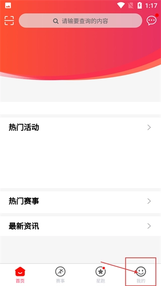 在首页底部找到【我的】按钮并点击,就能进入个人中心页面,该页面还设有【热门活动】-【热门赛事】等板块。