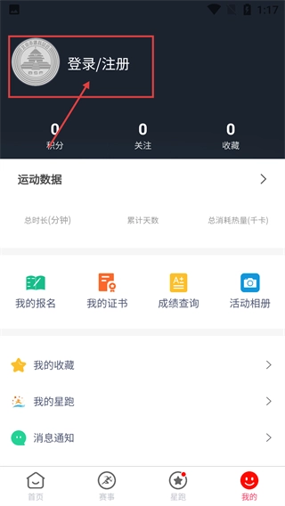 进入个人中心后,点击页面顶部的【登录/注册】区域,即可完成账号登录操作;此外,该页面还设有【运动数据】等功能的入口。