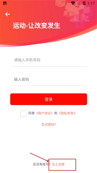 在登录页面,如果还没有账号,可以点击页面底部的【马上注册】按钮,进入注册界面。在注册页面,需要填写【手机号码】和【密码】等相关信息。