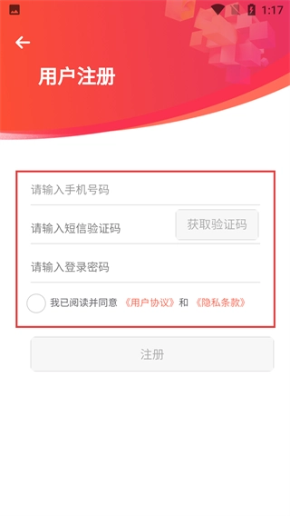 在注册页面,按顺序填写【手机号码】,接着获取并输入【短信验证码】,再设置【登录密码】,最后勾选相关协议,就能完成注册流程了。