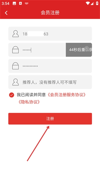 勾选“我已阅读并同意《会员注册服务协议》《隐私协议》”,再点击【注册】按钮,即可完成会员注册流程。