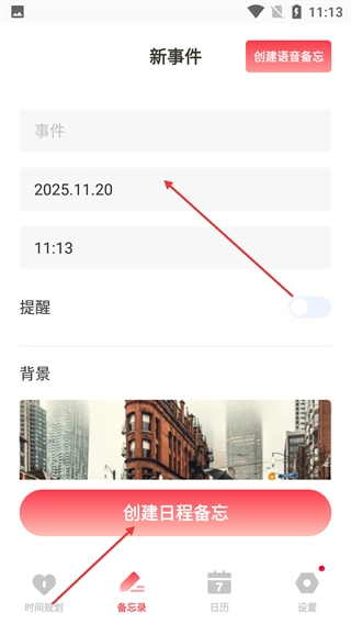 在【备忘录】页面,进入【新事件】编辑界面后,您可以填写事件的具体内容,选择对应的日期和时间,开启提醒功能,最后点击【创建日程备忘】按钮,即可完成此次记录。