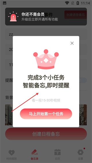 创建备忘时会弹出任务提示框,提示完成3个小任务即可解锁智能备忘功能,点击【马上开始第一个任务】就能参与任务以获取权限。