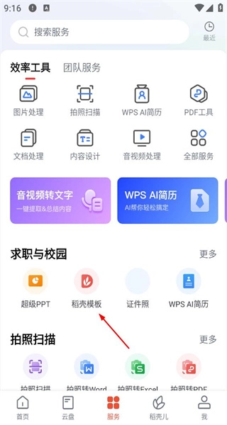 打开软件后,进入服务页面,这里会展示效率工具等各类功能分类。接着,在“求职与校园”分类中找到并点击“稻壳模板”,即可进入模板选择界面。