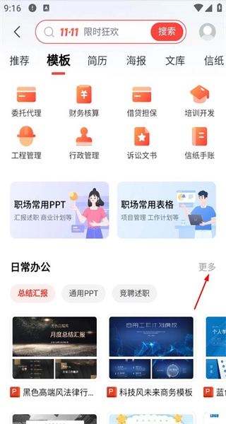 在稻壳模板界面,点击日常办公分类下的更多选项,即可进入日常办公模板列表页面。