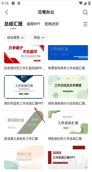 在日常办公模板的列表页面里,挑选简洁蓝色风格的工作总结汇报PPT模板,接着进入这个模板的详情页面。