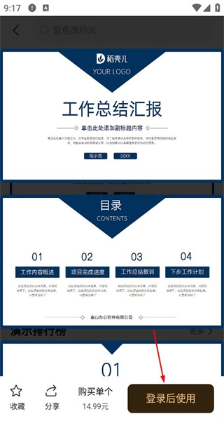 在模板详情页浏览完模板内容后,点击“登录后使用”按钮,即可准备登录并使用该模板。