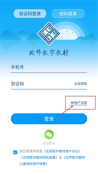 进入登录页面后,可通过验证码、密码或微信三种方式登录;若尚未拥有账号,点击【新用户注册】按钮即可启动账号注册流程。