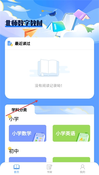 登录后进入首页,既能查看【最近读过】的记录,也可以通过【学科分类】挑选小学数学、小学英语等教材资源来开展学习。