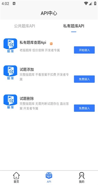 进入API中心后,选择“查题API试题存在查询”功能,点击“免费接入”即可开始使用;此外,界面上还提供了其他类型的查题API接口选项供选择。