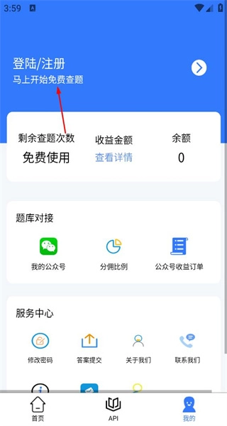 打开软件后,进入“我的”页面,点击登录注册入口进入登录界面,该页面会展示剩余查题次数等功能板块。