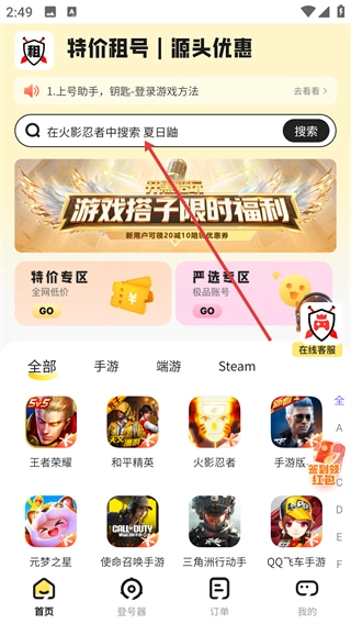 在搜索框里输入你想租号的游戏名称,比如三国杀,然后点击搜索按钮。