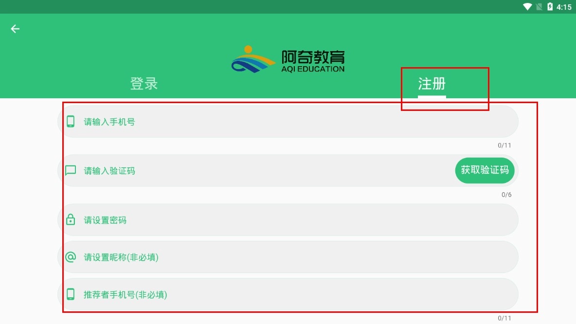 若尚未注册,可点击【注册】按钮,依次输入手机号码、验证码并设置密码,昵称(非必填项)和推荐人手机号(非必填项)可根据需求填写,即可完成注册操作。