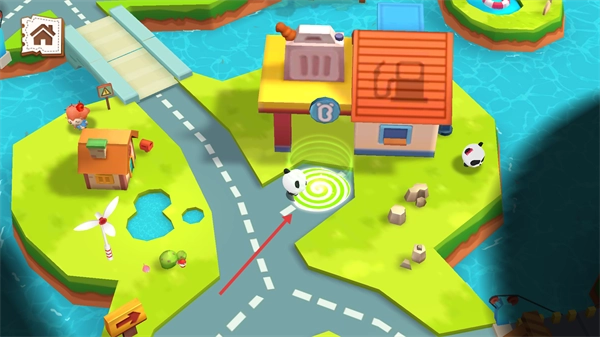 进入游戏界面后,能看到熊猫角色置身于迷宫场景之中,需要操控这个角色朝着目标区域(带有螺旋标识的地方)移动,这个场景里包含了建筑、水域等各类元素。