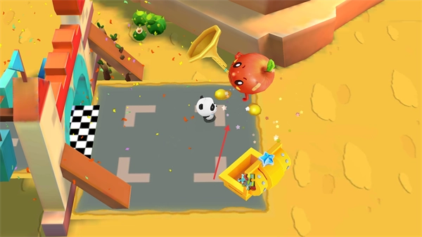 在快要抵达关卡终点的时候,要控制熊猫角色走到黑白格的终点区域,期间还能拾取场景里的苹果类物品,做完这些就能通过当前关卡了。