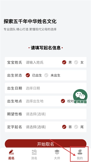 进入起名界面后,可点击底部的【开始取名】按钮,也能通过底部的【我的】选项进入个人中心。