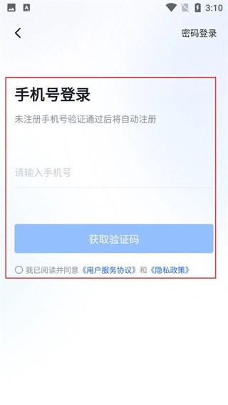 选择【手机登录】后,可在密码登录和验证码登录这两种方式之间进行切换,操作前需要先勾选用户协议与隐私政策。