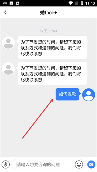 在咨询输入页面填写您想咨询的问题(例如如何办理退款),就能提交咨询内容了。