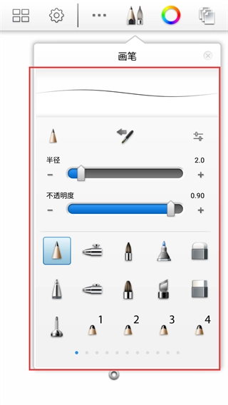 进入画笔设置界面后,能够对【半径-2.0】和【不透明度-0.90】进行调整,还可以从丰富的笔尖样式里挑选合适的,以满足不同的绘制笔触要求。