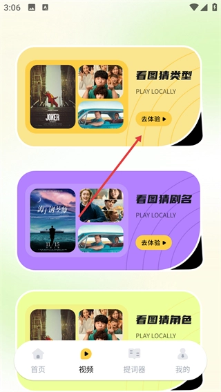 在视频页面找到【看图猜类型】板块里的【去体验】按钮并点击,即可进入看图猜类型的关卡页面。