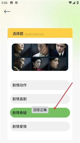 在答题页面挑选正确的选项(例如剧情悬疑类),并完成答题的相关操作。