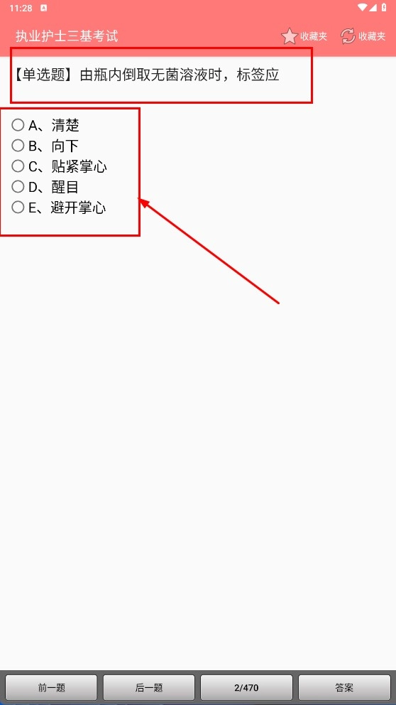 比如碰到“倒取无菌溶液时标签如何处理”这类题目,依据自身的判断选择答案C(贴紧掌心),这样就能防止标签受到污染。