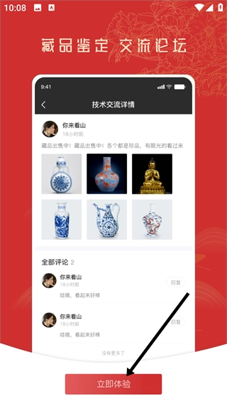 进入藏品鉴定交流论坛界面后,点击【立即体验】按钮,即可启动软件的使用流程。