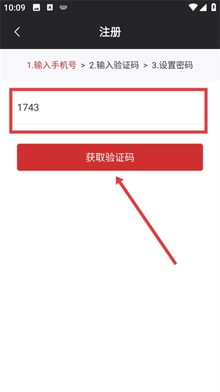 在注册页面,先输入手机号码,接着点击【获取验证码】按钮,然后继续完成后续的注册步骤。