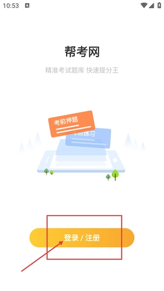在帮考网的启动页面点击【登录/注册】按钮,进入登录界面,这是使用平台题库、课程等功能的前提步骤。