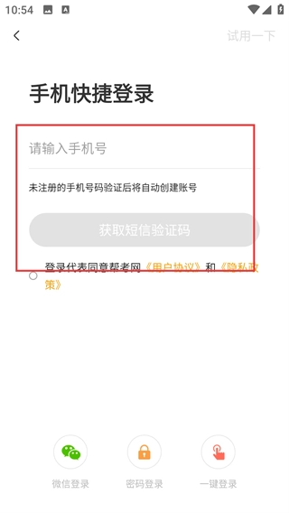 您可以选择【手机快捷登录】的方式,先在输入框中填写您的手机号,接着勾选同意相关协议,完成这些步骤后,就可以点击【获取短信验证码】来进行验证了。