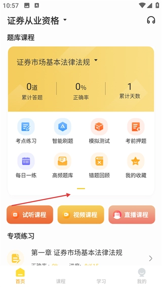 登录后进入主界面,能看到【考点练习】【智能刷题】等功能入口,还有【试听课程】之类的学习资源,大家可以根据自身需求选择合适的学习功能。