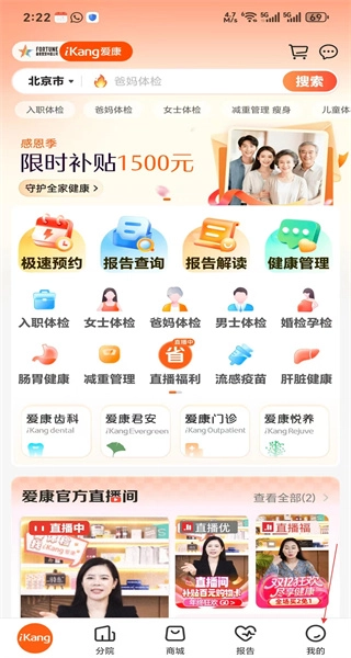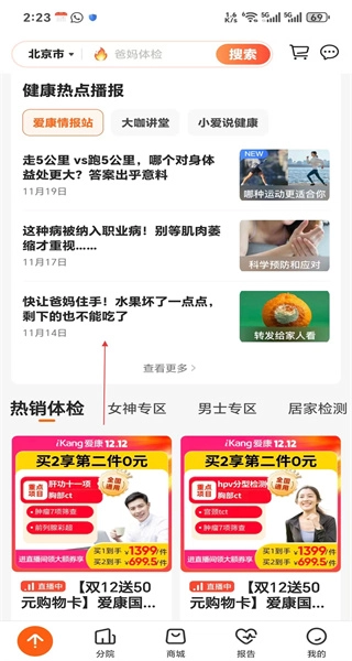 登录完成后返回爱康首页,就能看到健康热点播报、热销体检等板块,你可以在这里浏览健康资讯,也能挑选体检服务。