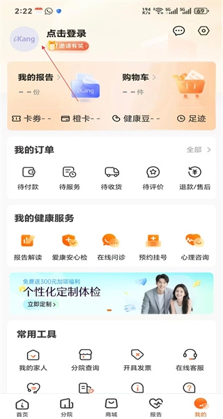 打开软件后,能看到各类体检服务的入口以及功能模块,底部导航栏设有“我的”按钮,点击该按钮即可进入个人中心页面。