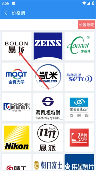 在价格册页面选择“暴龙”品牌,即可进入暴龙镜片价格册的详情页面。