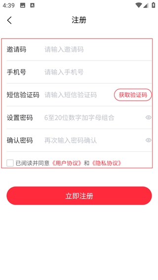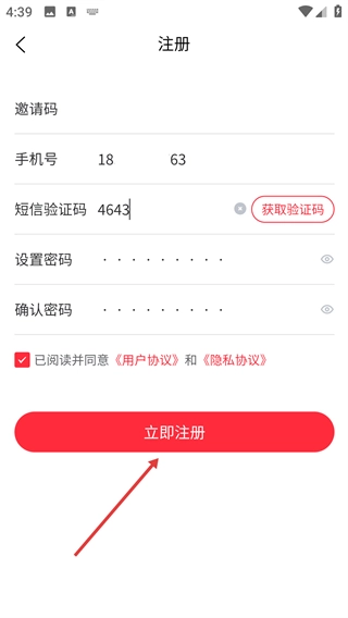 在注册界面填写邀请码、手机号码、短信验证码,设置并确认密码,同时勾选同意相关协议。