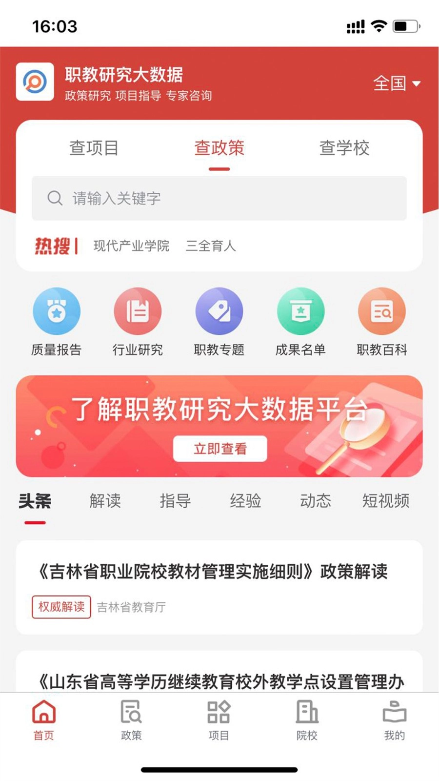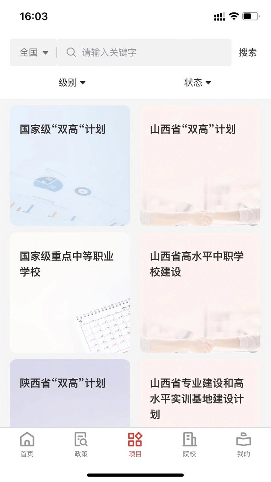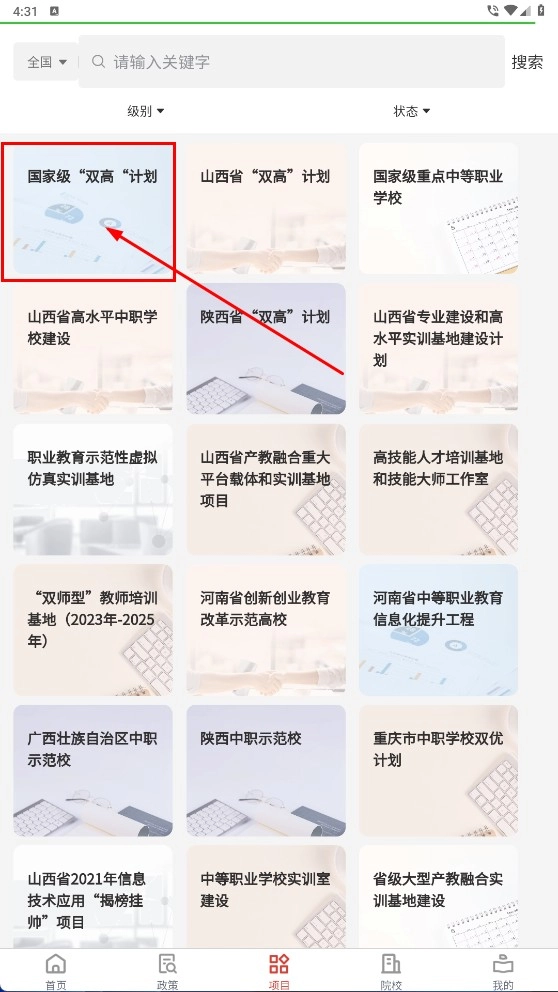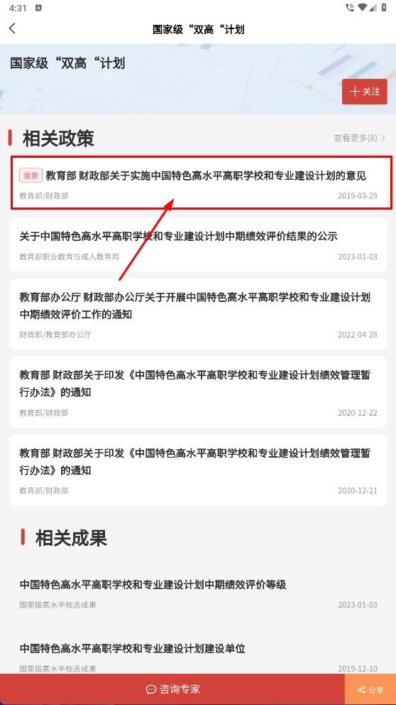进入项目板块后,点击【国家级“双高”计划】,即可查看该计划的相关政策及成果信息。