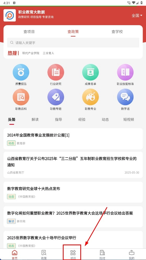在职业教育大数据平台的首页,点击【项目】选项,就能进入项目板块,探索与职业教育相关的各类项目资源。