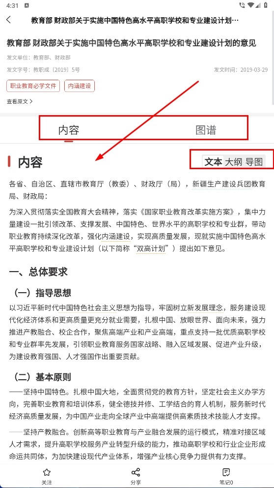 打开政策详情页面后,可以在【内容】【文本】【大纲】【导图】这几个选项之间进行切换,以便查看政策的结构。