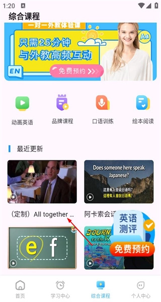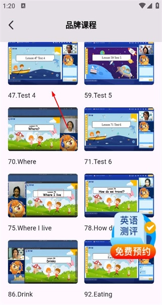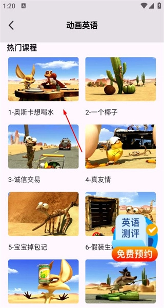 在综合课程页面,点击最近更新的定制课程,即可进入动画英语分类页面,该页面会呈现热门课程的列表。