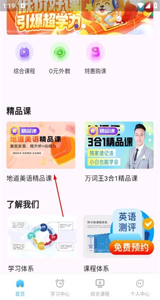 打开软件后,找到并点击地道美语精品课的入口,即可进入综合课程界面,该界面包含动画英语、品牌课程等不同类别的课程入口。