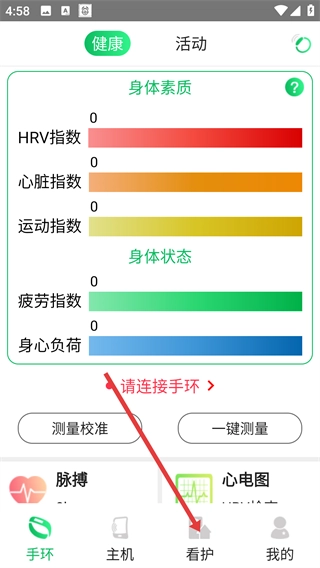 在健康应用的界面里,点击底部的【看护】按钮,就能进入看护页面。