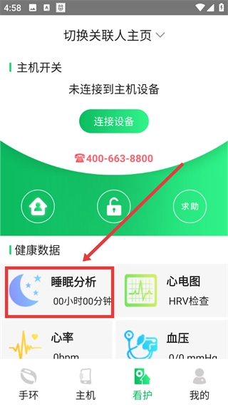 在看护页面中,点击【睡眠分析】选项,即可进入睡眠分析页面。