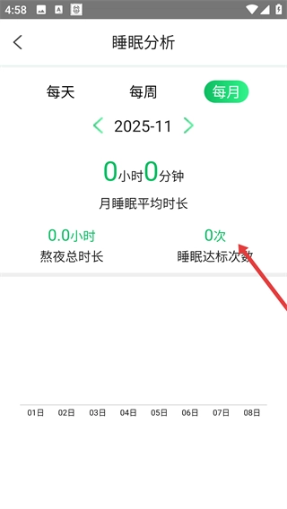 在月度睡眠分析界面里,可查看月均睡眠时长、熬夜累计时长、睡眠达标回数等数据,以此掌握每月睡眠状况。