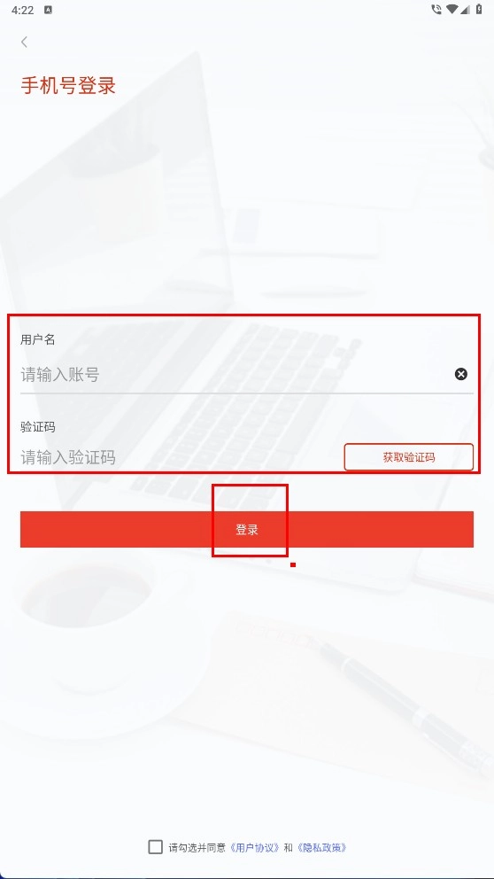 在手机号登录页面,先输入对应的账号,接着点击【获取验证码】按钮,待收到验证码后将其填入相应位置,随后勾选同意相关协议,最后点击【登录】按钮即可完成验证流程。